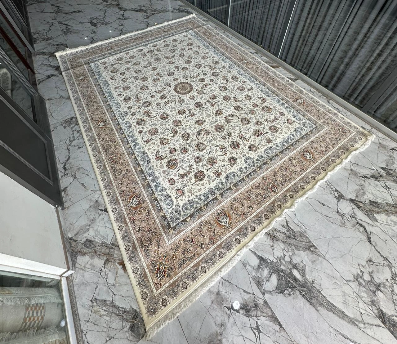 The rug also complements marble flooring, wooden floors, and contemporary tile designs, making it a versatile addition to a range of architectural styles.